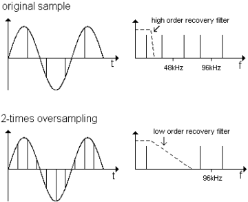 - Oversampling. Improving resolution and SNR, helpful in avoiding aliasing and phase distortion. Oversampling involves multiplying the original sampling rate by an integer factor (e.g., 2x, 4x, or more). For instance, a 44.1 kHz signal can be oversampled to 88.2 kHz or higher. This is achieved by inserting additional “interpolated” samples between the original ones using mathematical algorithms and filtering.