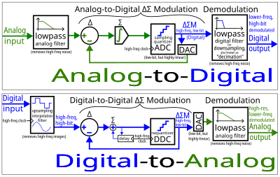 Delta-sigma modulation achieves high quality by utilizing a negative feedback loop during quantization to the lower bit depth that continuously corrects quantization errors and moves quantization noise to higher frequencies well above the original signal’s bandwidth. Subsequent low-pass filtering for demodulation easily removes this high frequency noise and time averages to achieve high accuracy in amplitude, which can be ultimately encoded as pulse-code modulation (PCM).omes the next stage of the signal digitization, quantization.